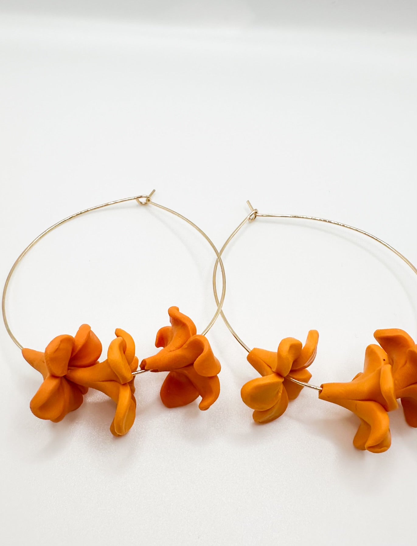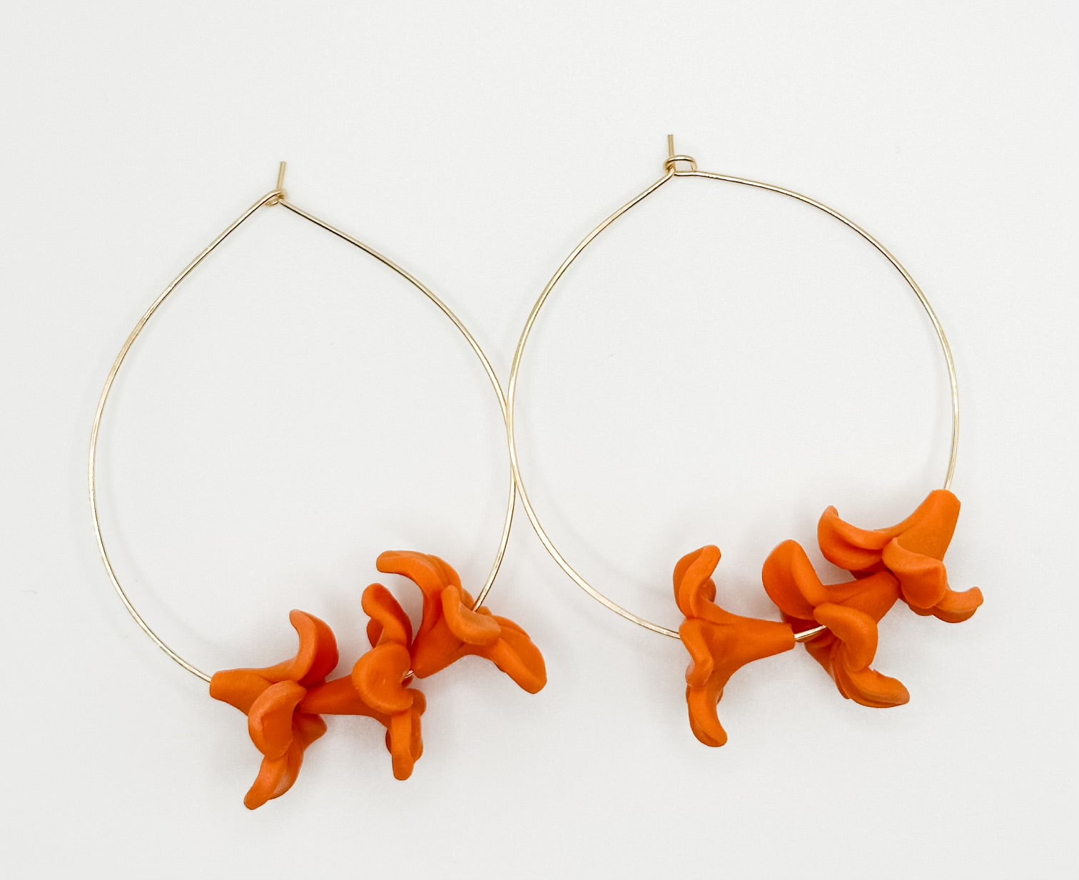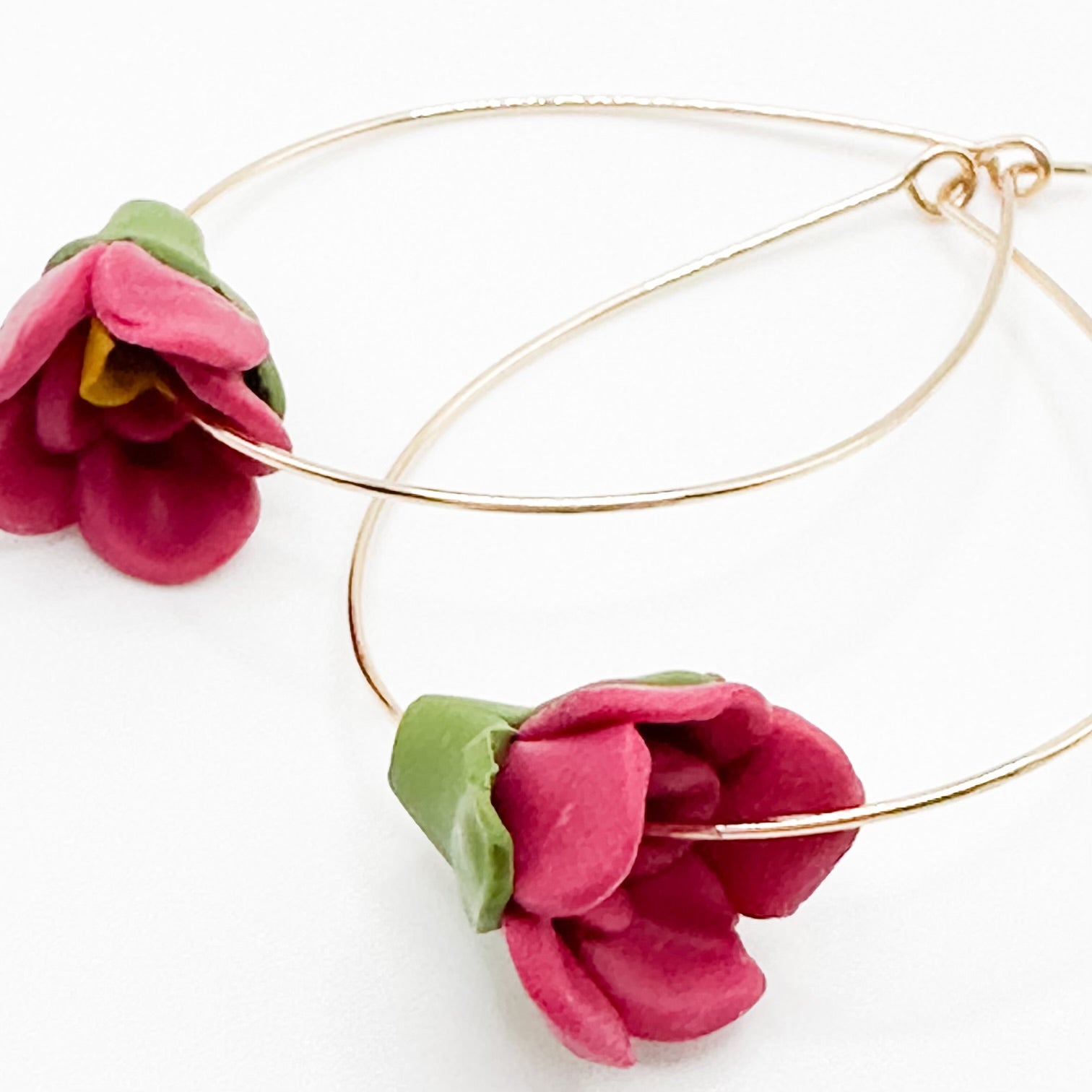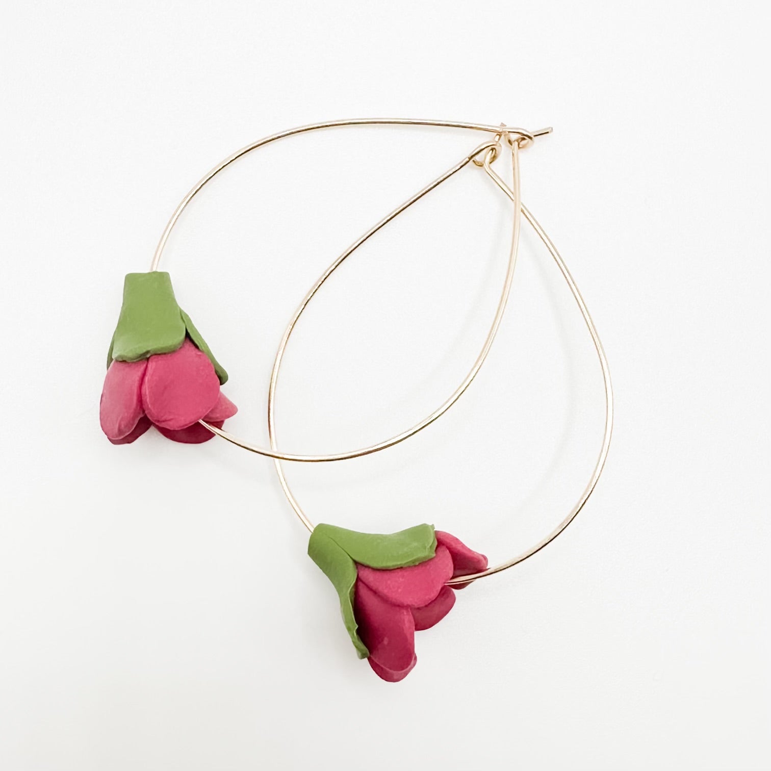 A different take on the traditional hoop earring, these teardrops are lightweight and classy. Each earring includes three flowers of choice. Gold filled, 2.5" in length.