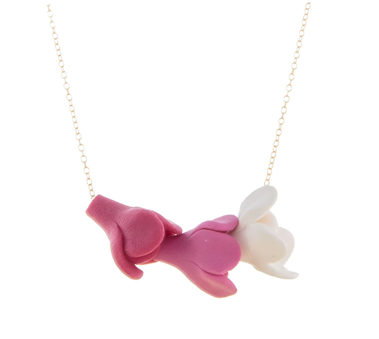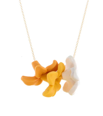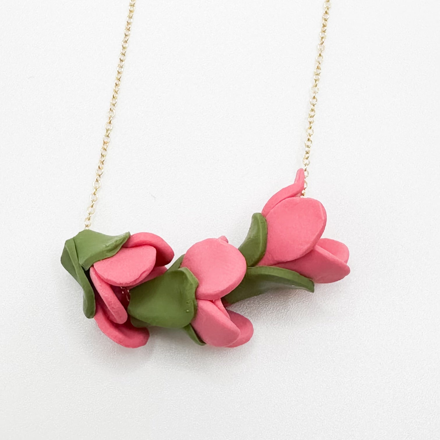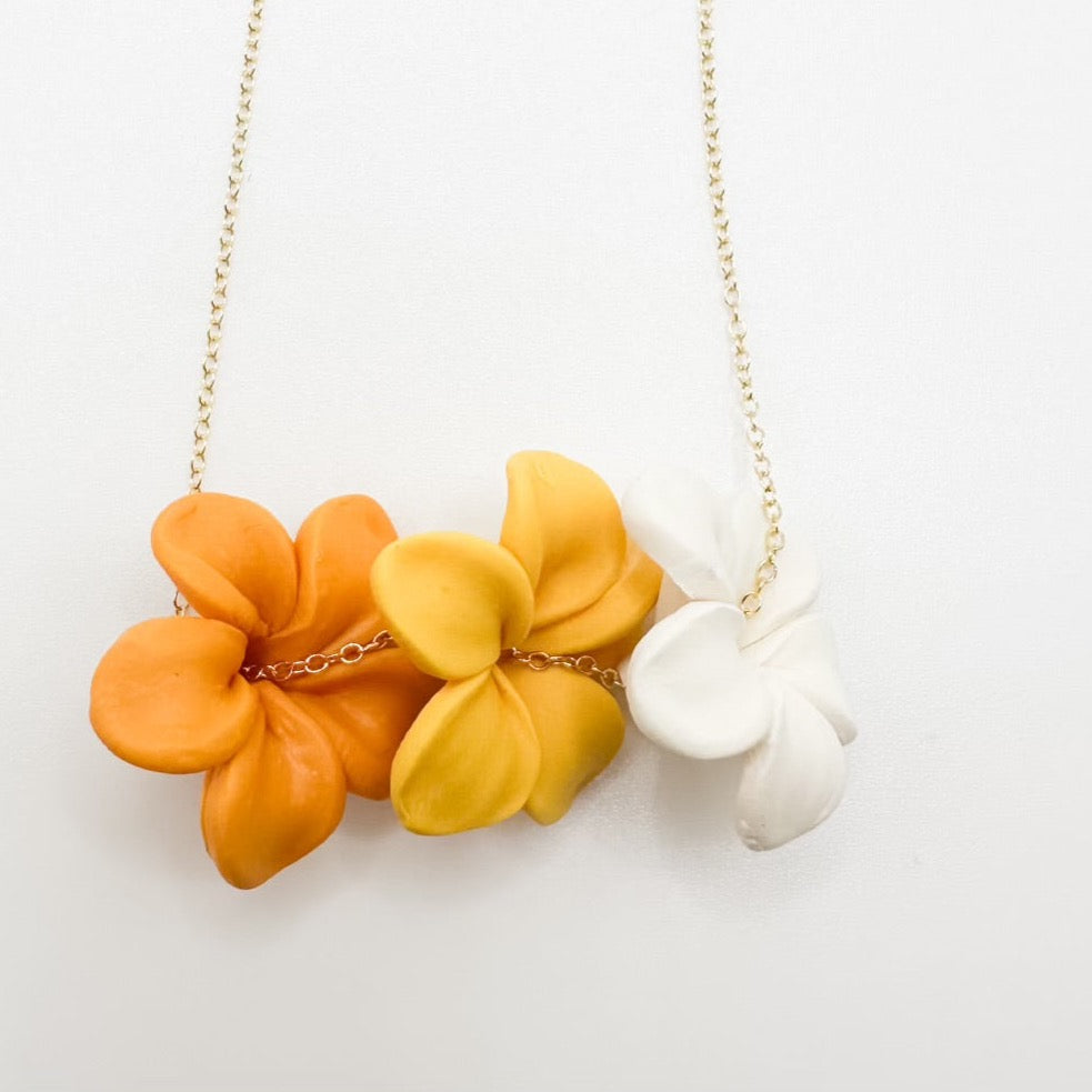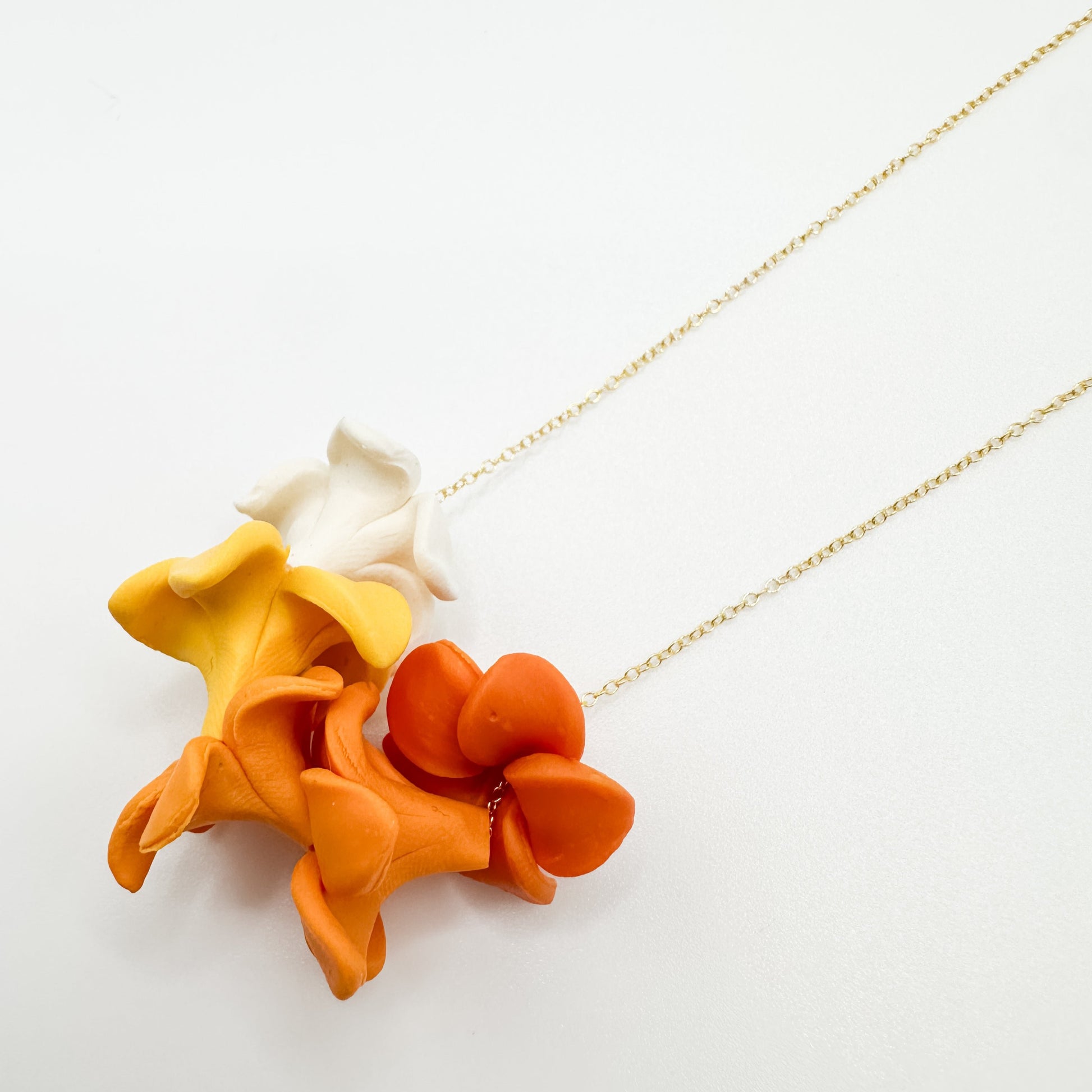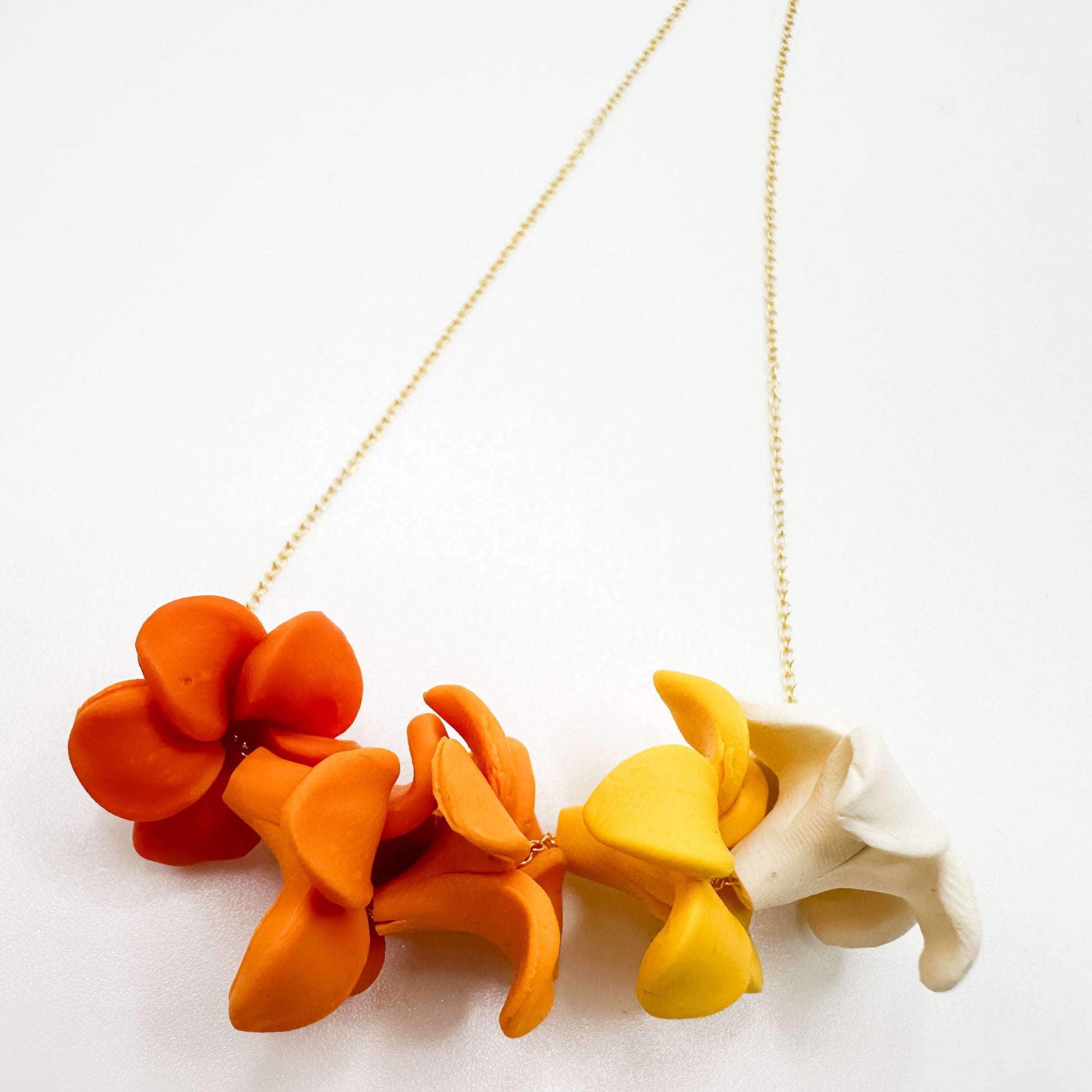The floating flower necklace features 3 or 5 flowers floating on a 14K gold filled cable chain. This necklace adds the perfect pop of color to your favorite LBD. The flowers are handmade with Polymer clay. Total length 18".