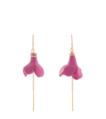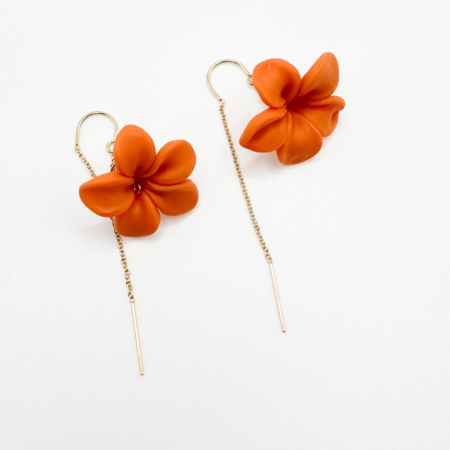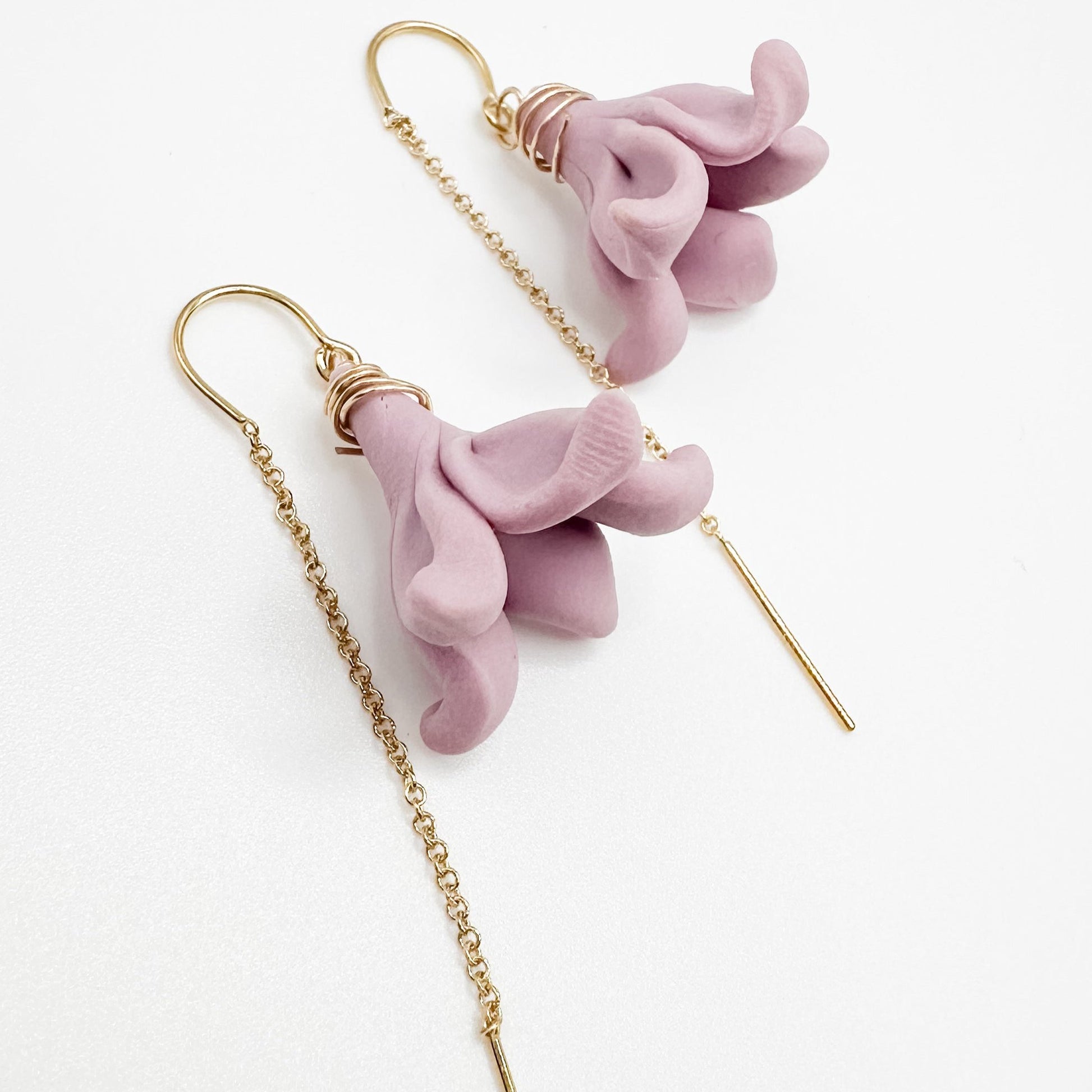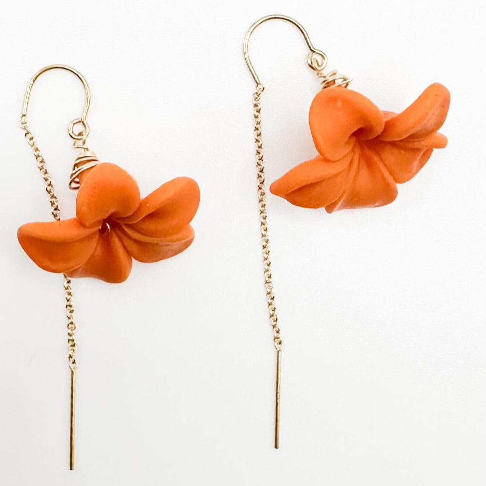 Threaders let your forever flowers hang in the spotlight. Smooth wire tips allow for easy threading through your earlobe. Seamless curved wire sits perfectly keeping your earrings in place and worry-free all day. 14K gold filled with handmade polymer clay flowers.