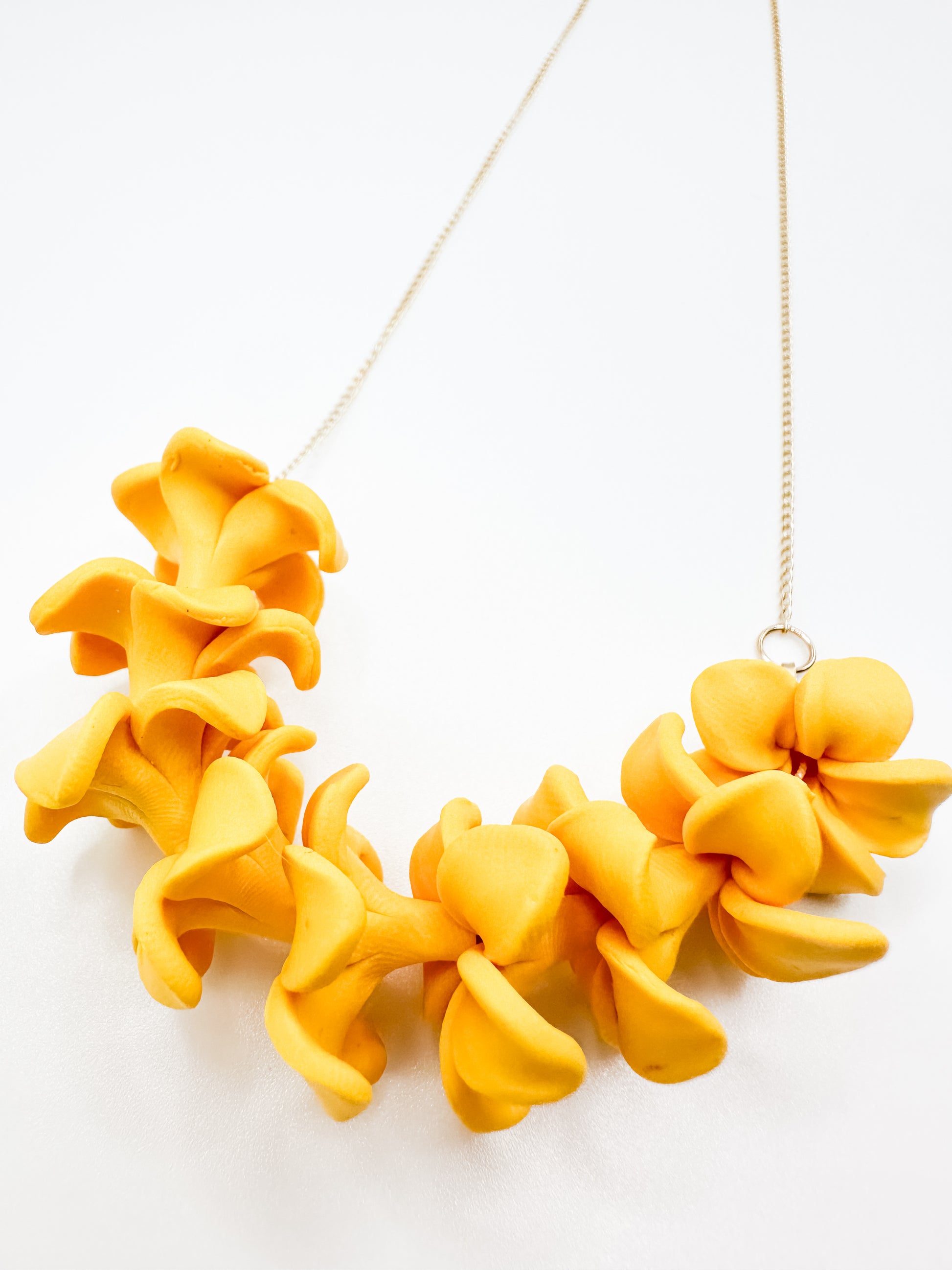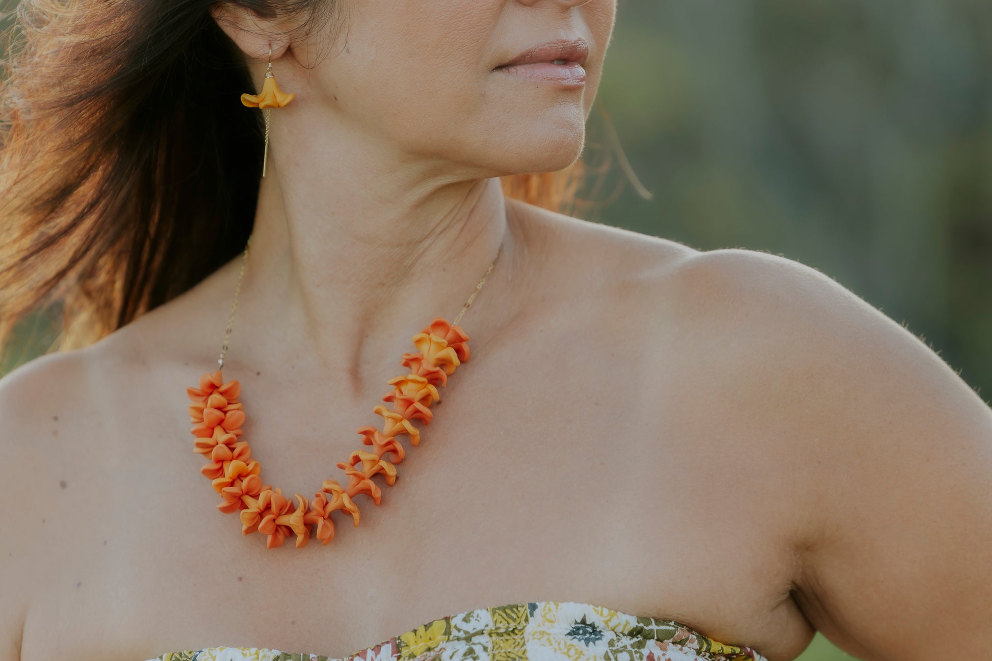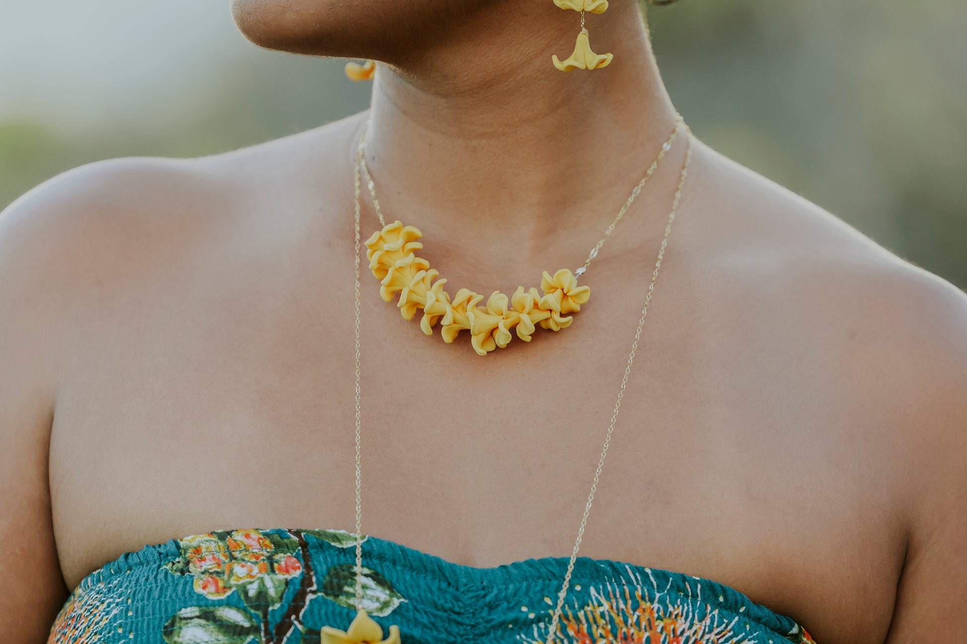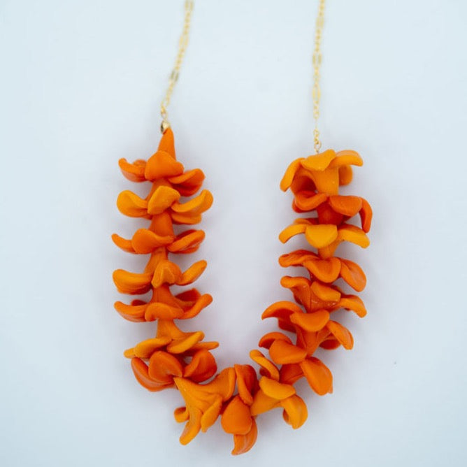 Puakenikeni was introduced to Hawaii in the late 1800's, it's strong trumpet shaped structure and bold fragrance are perfect for lei making. Handmade polymer flowers strung on silk thread and attached to 14K gold chain and findings (lobster clasp). Total length 18".