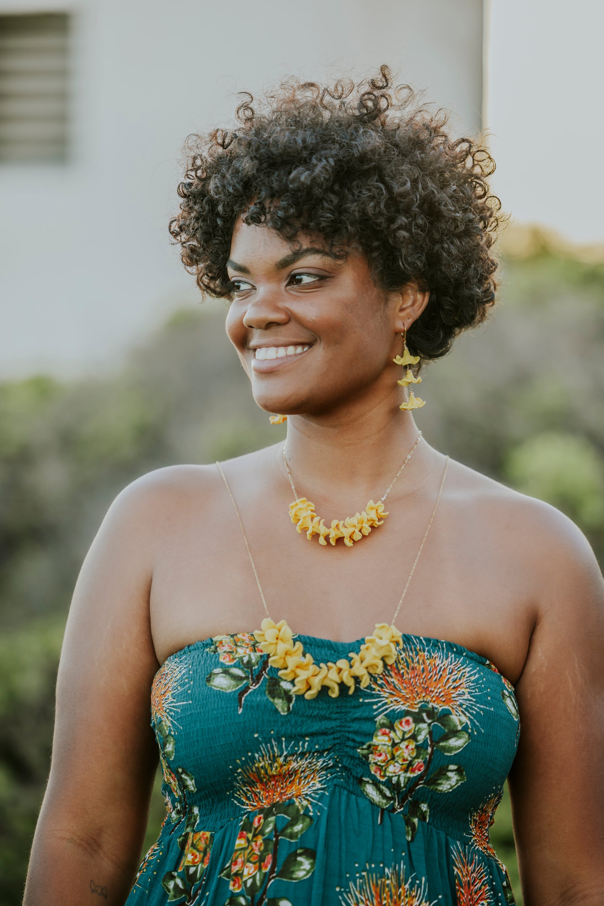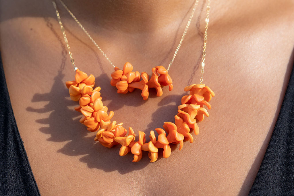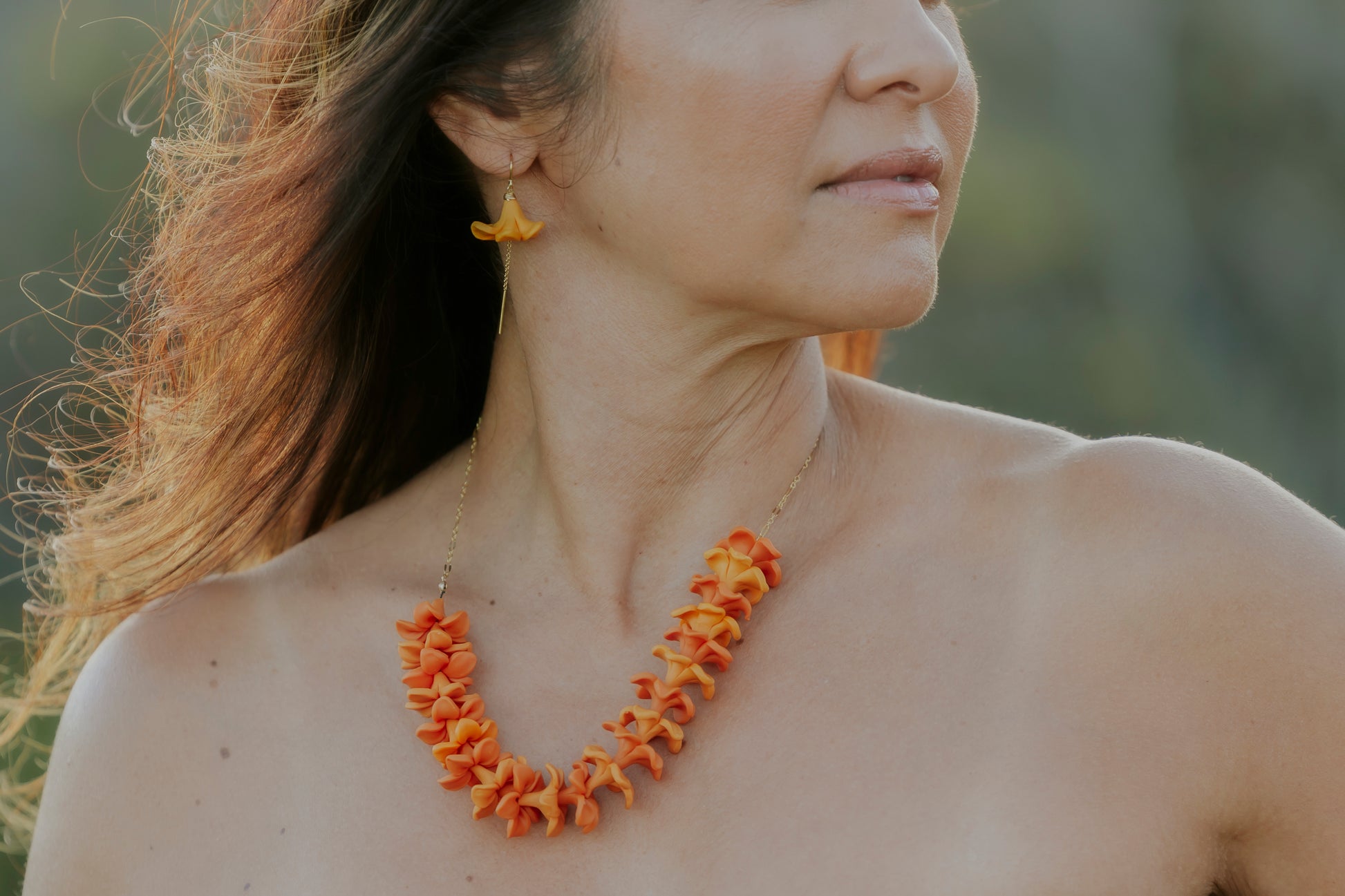 Puakenikeni was introduced to Hawaii in the late 1800's, it's strong trumpet shaped structure and bold fragrance are perfect for lei making. Handmade polymer flowers strung on silk thread and attached to 14K gold chain and findings (lobster clasp). Total length 18".