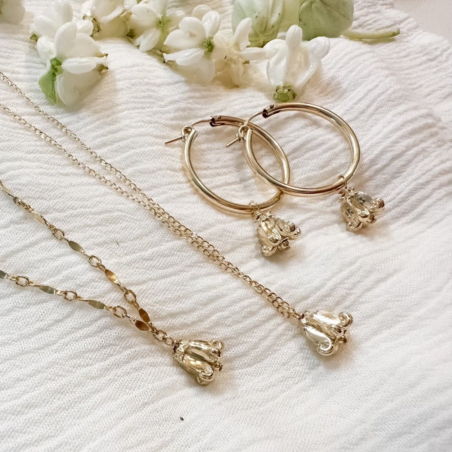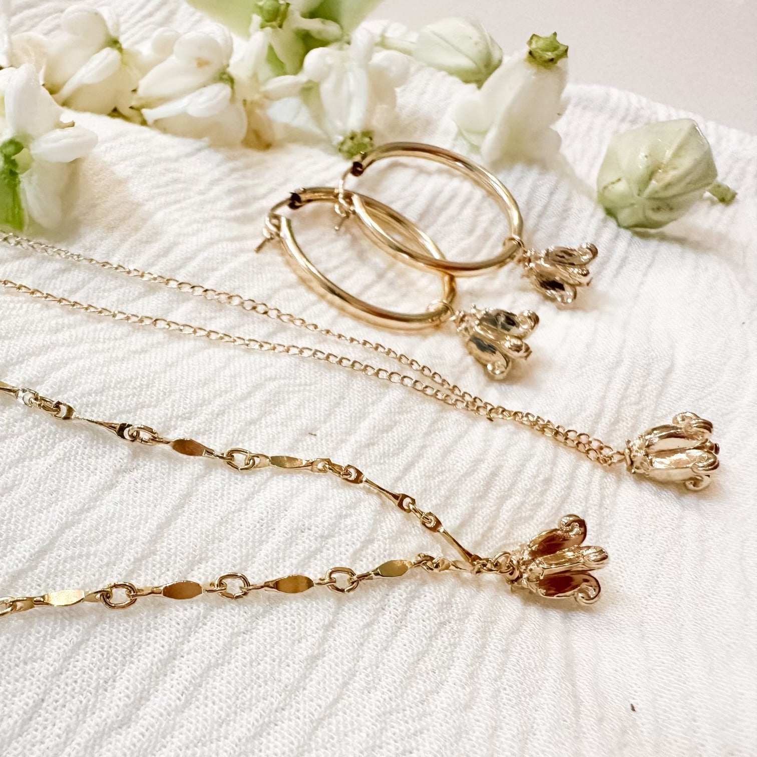 This piece was designed with the Crown flower as the inspiration. The design is 3D printed and casted in solid 14k gold or sterling silver. I work with a jewelry caster locally in Honolulu and all flowers are hand casted in his studio. Solid 14K gold or sterling silver pendant. Chains come in 16" or 18" in 14K gold, 14K gold filled and sterling silver.