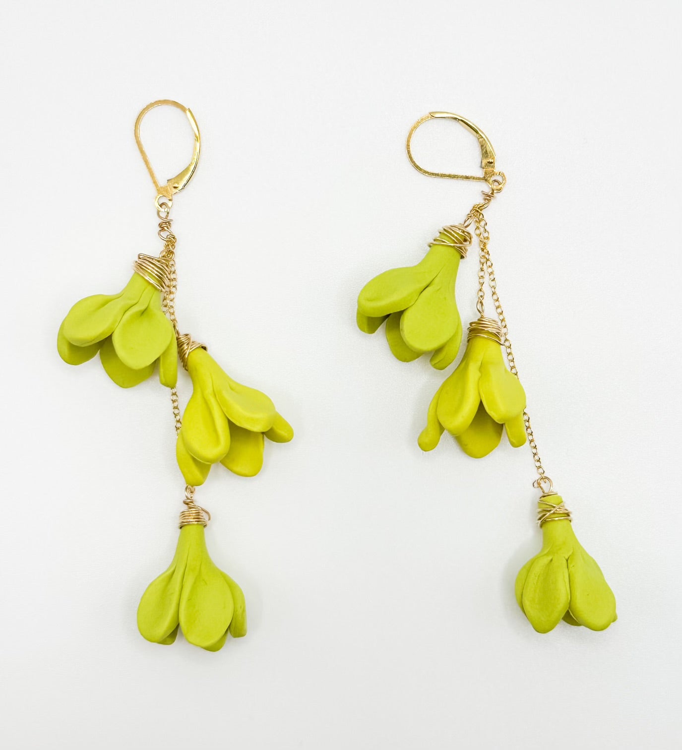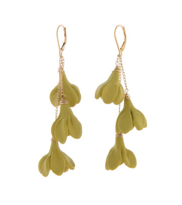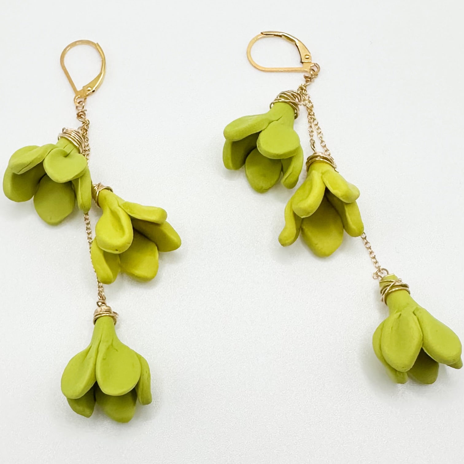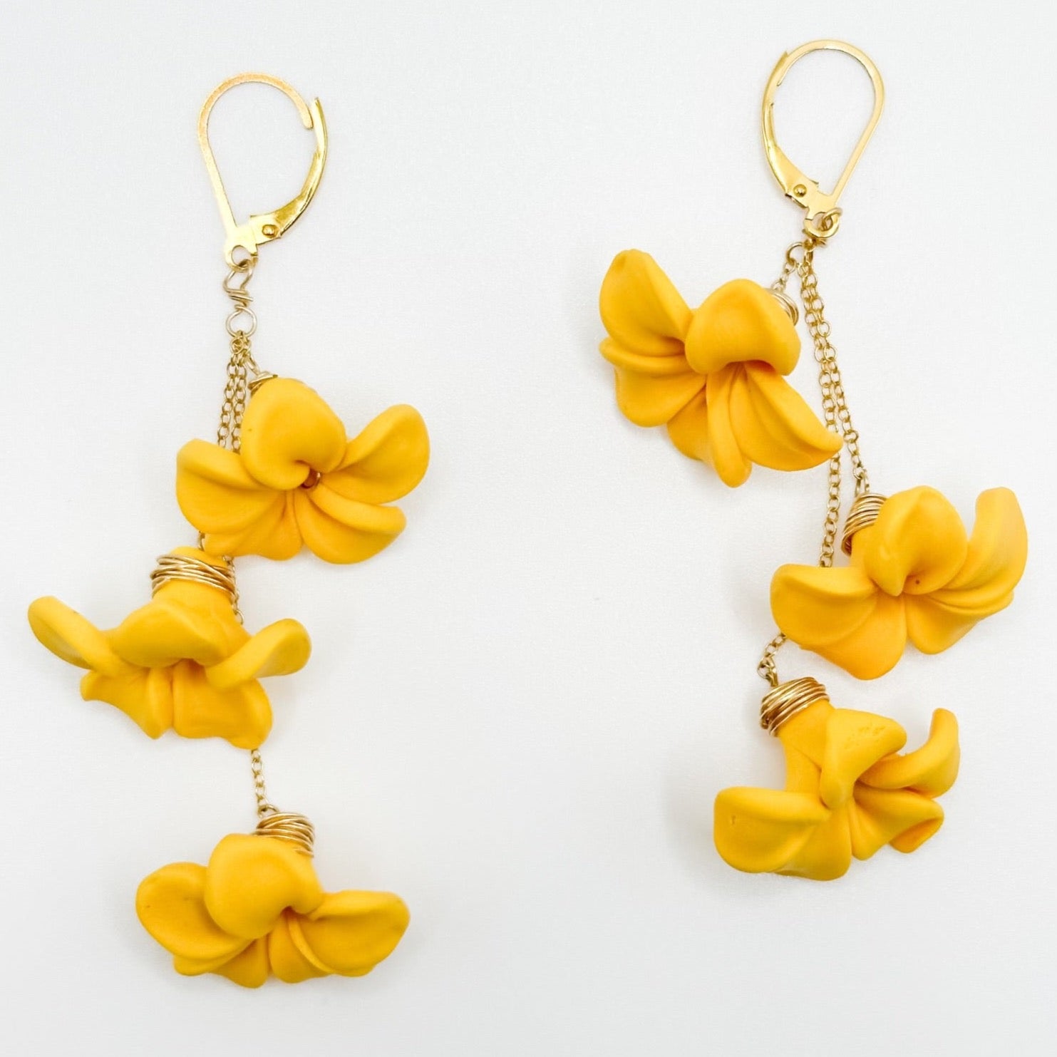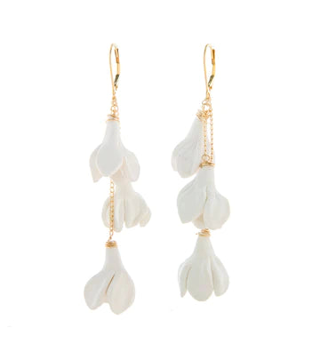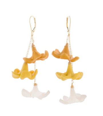These earrings feature a cascading trio of flowers to add the perfect drama to any outfit or occasion. Flowers are handmade using polymer clay. Total length 2.5-2.75", 14K Gold Filled curb chain and lever back.