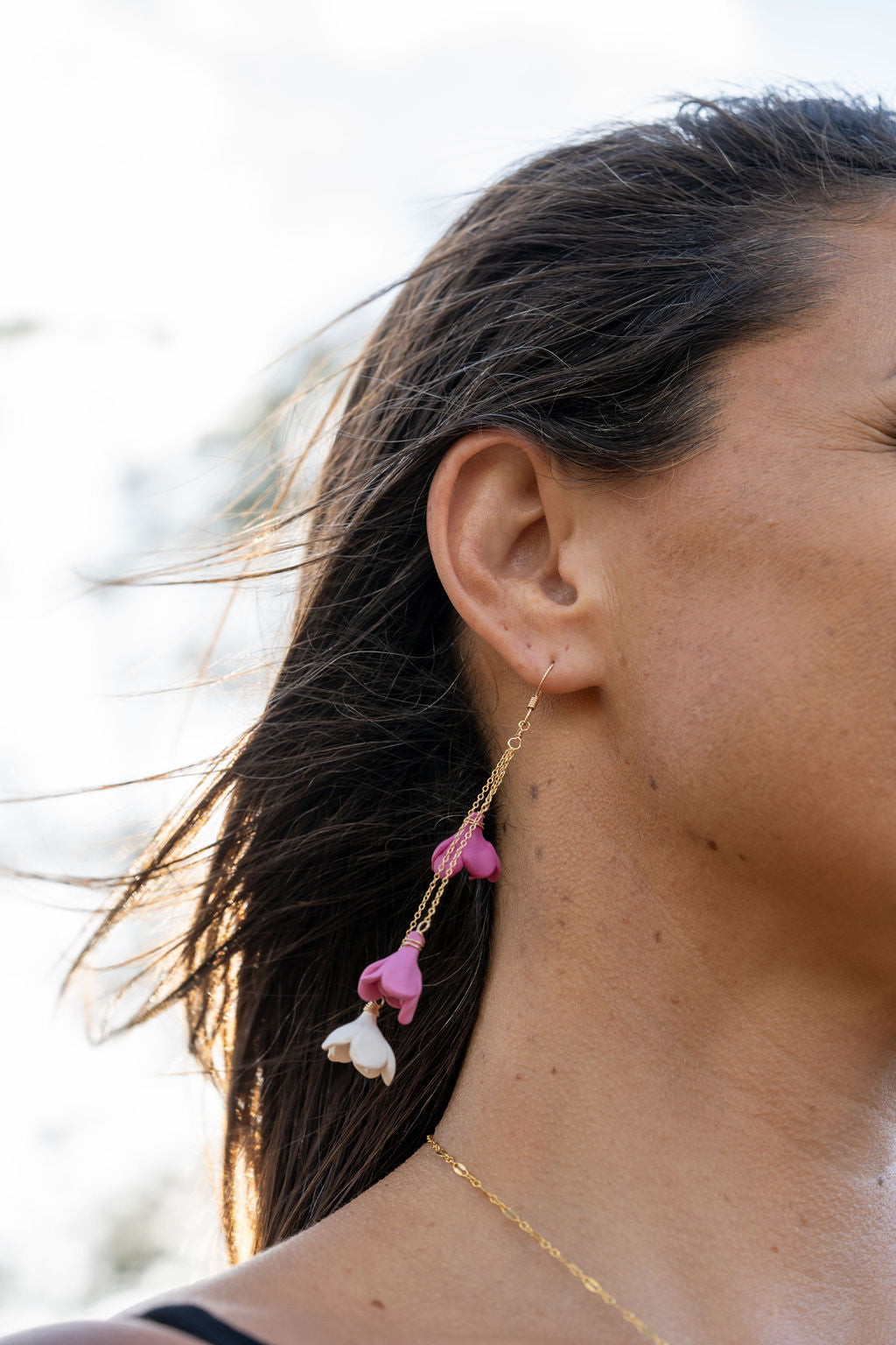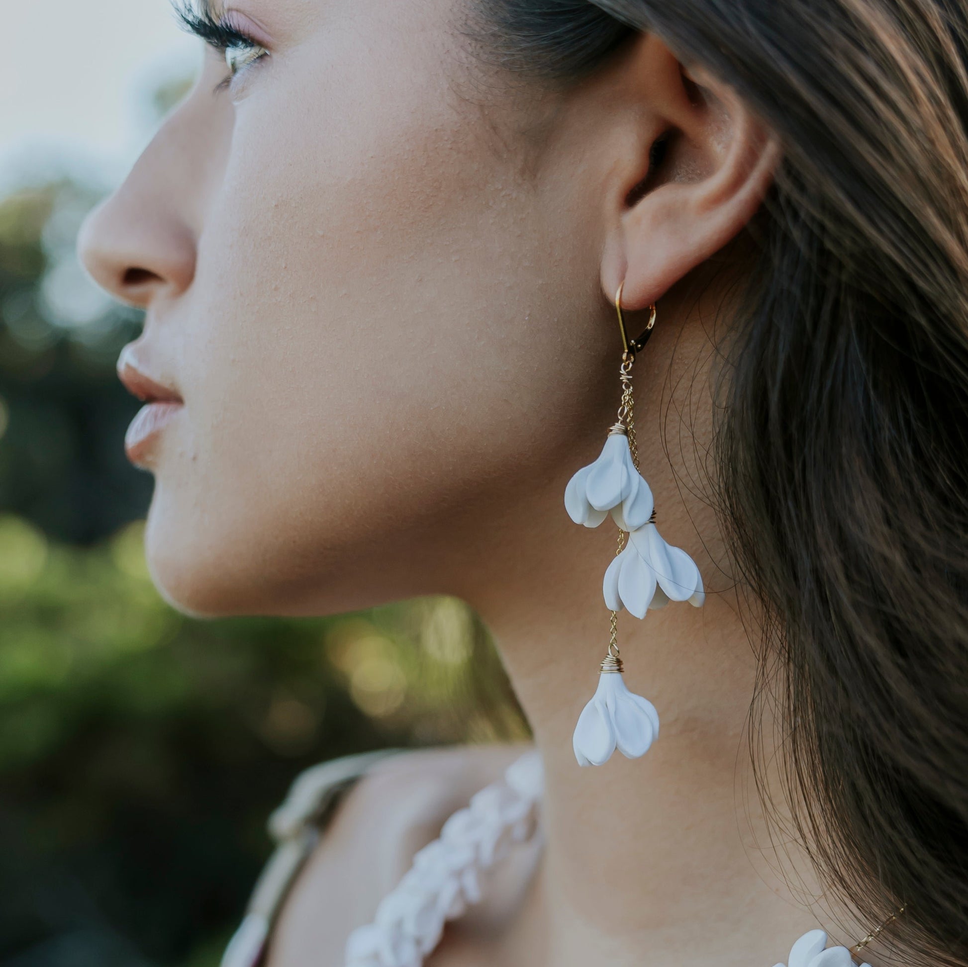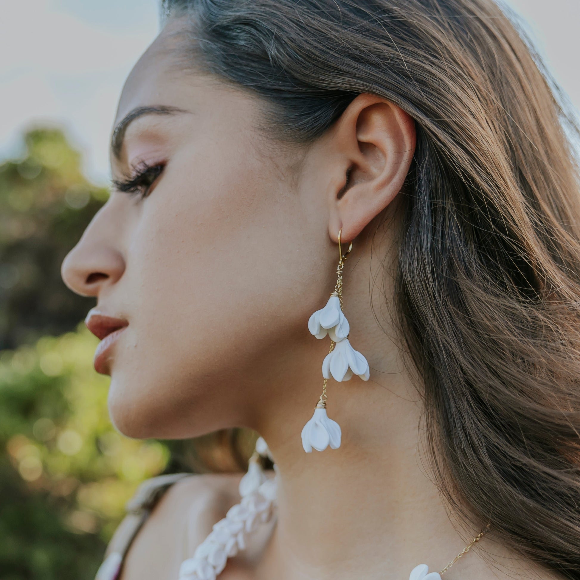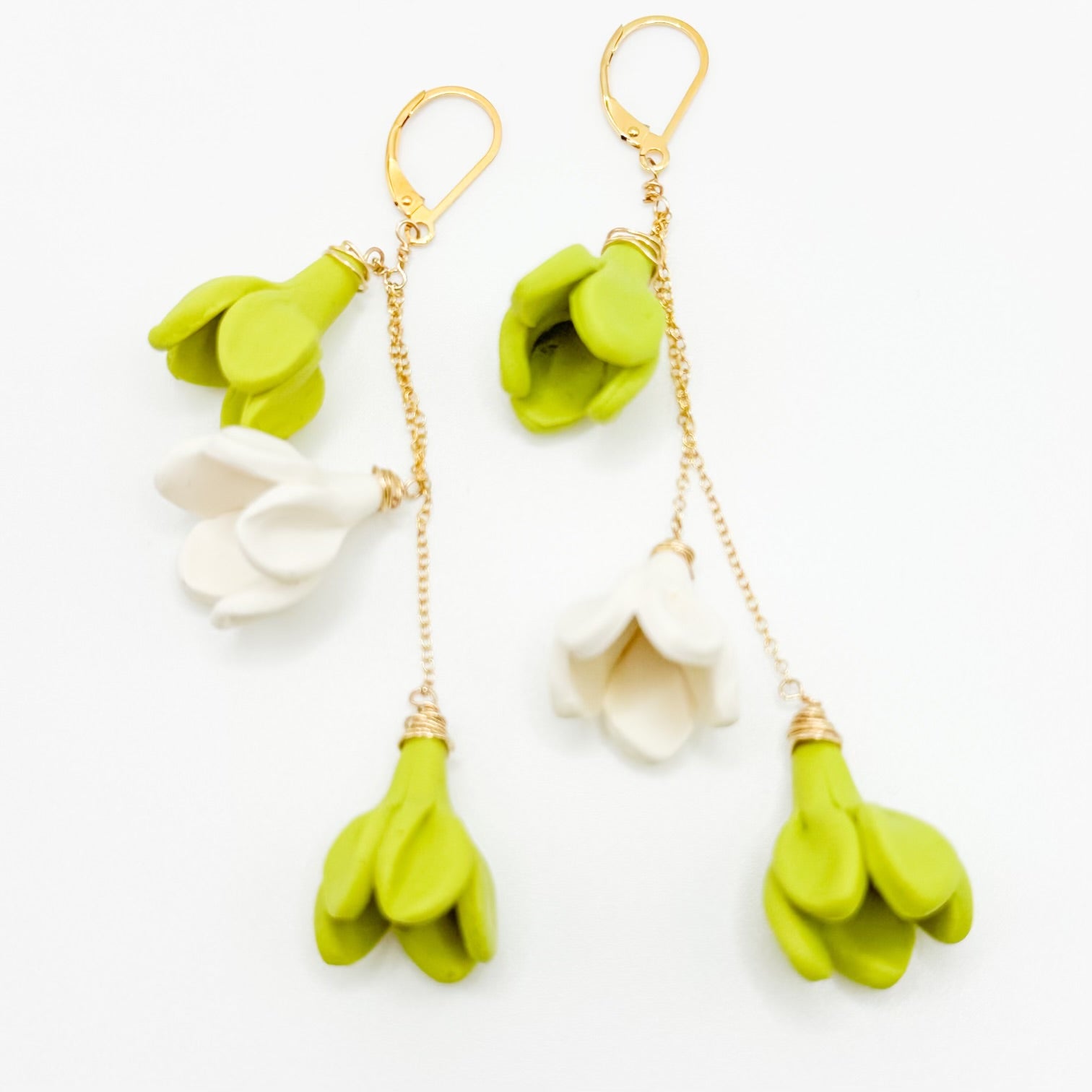 These earrings feature a cascading trio of flowers to add the perfect drama to any outfit or occasion. Flowers are handmade using polymer clay. Total length 2.5-2.75", 14K Gold Filled curb chain and lever back.