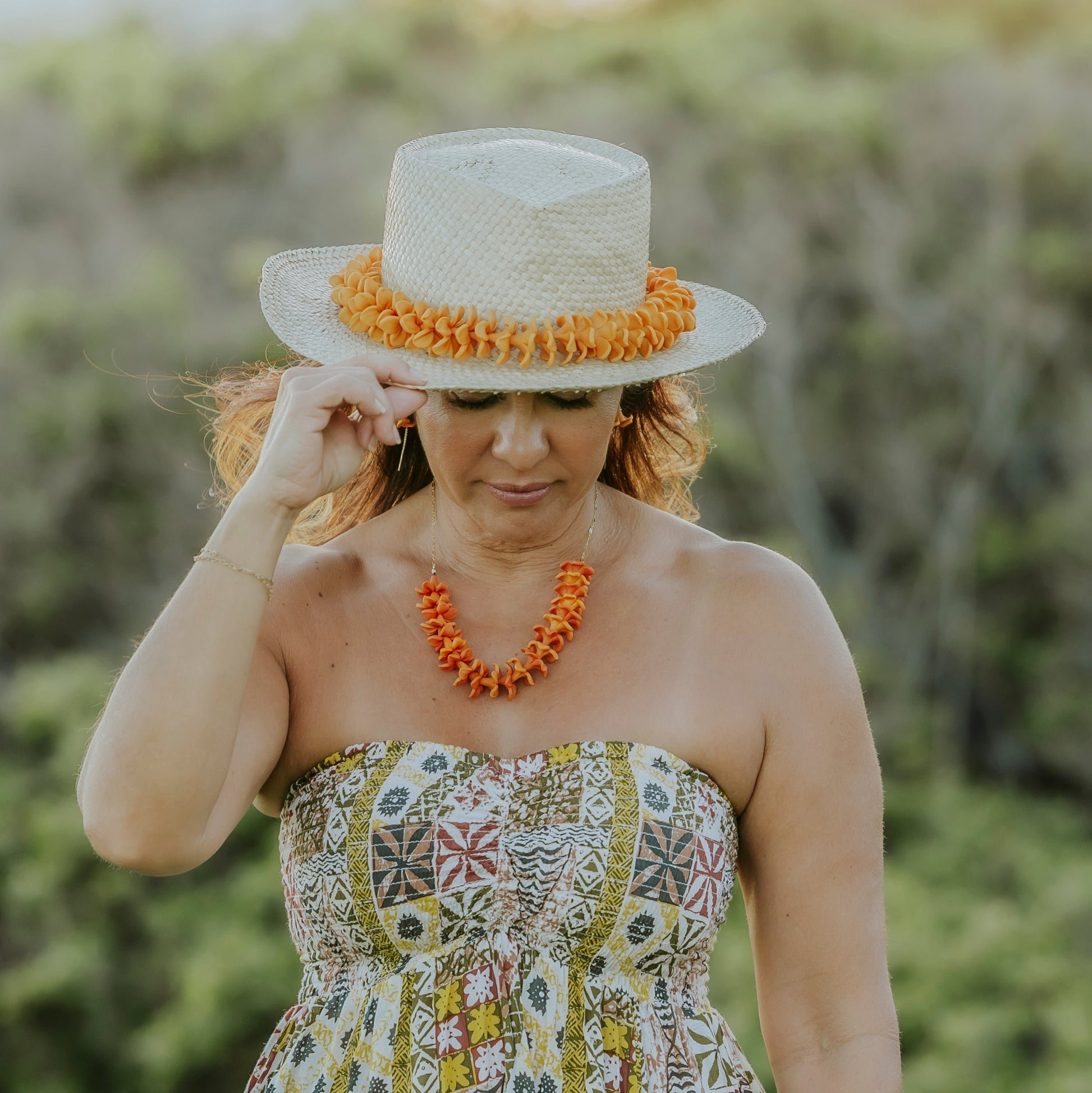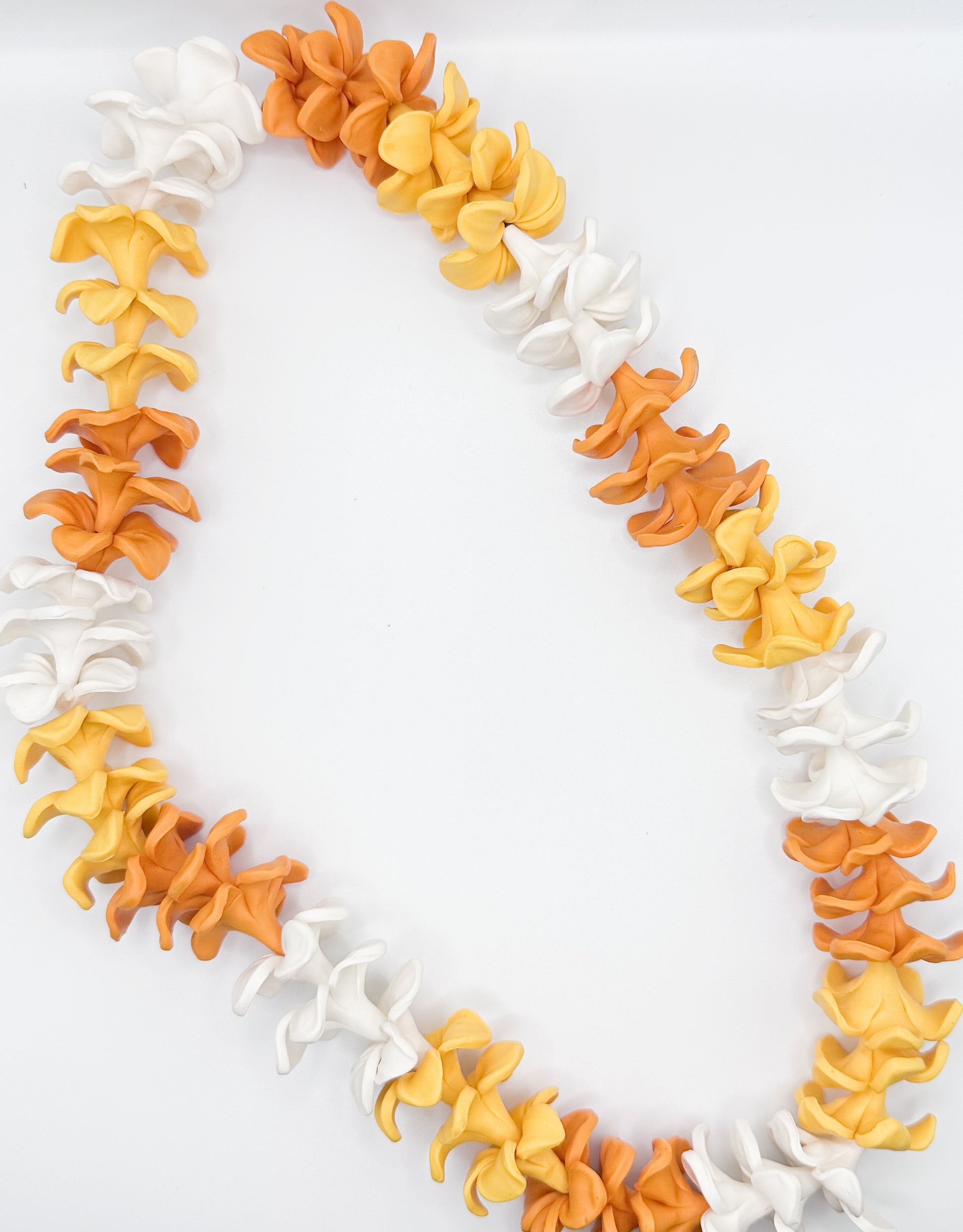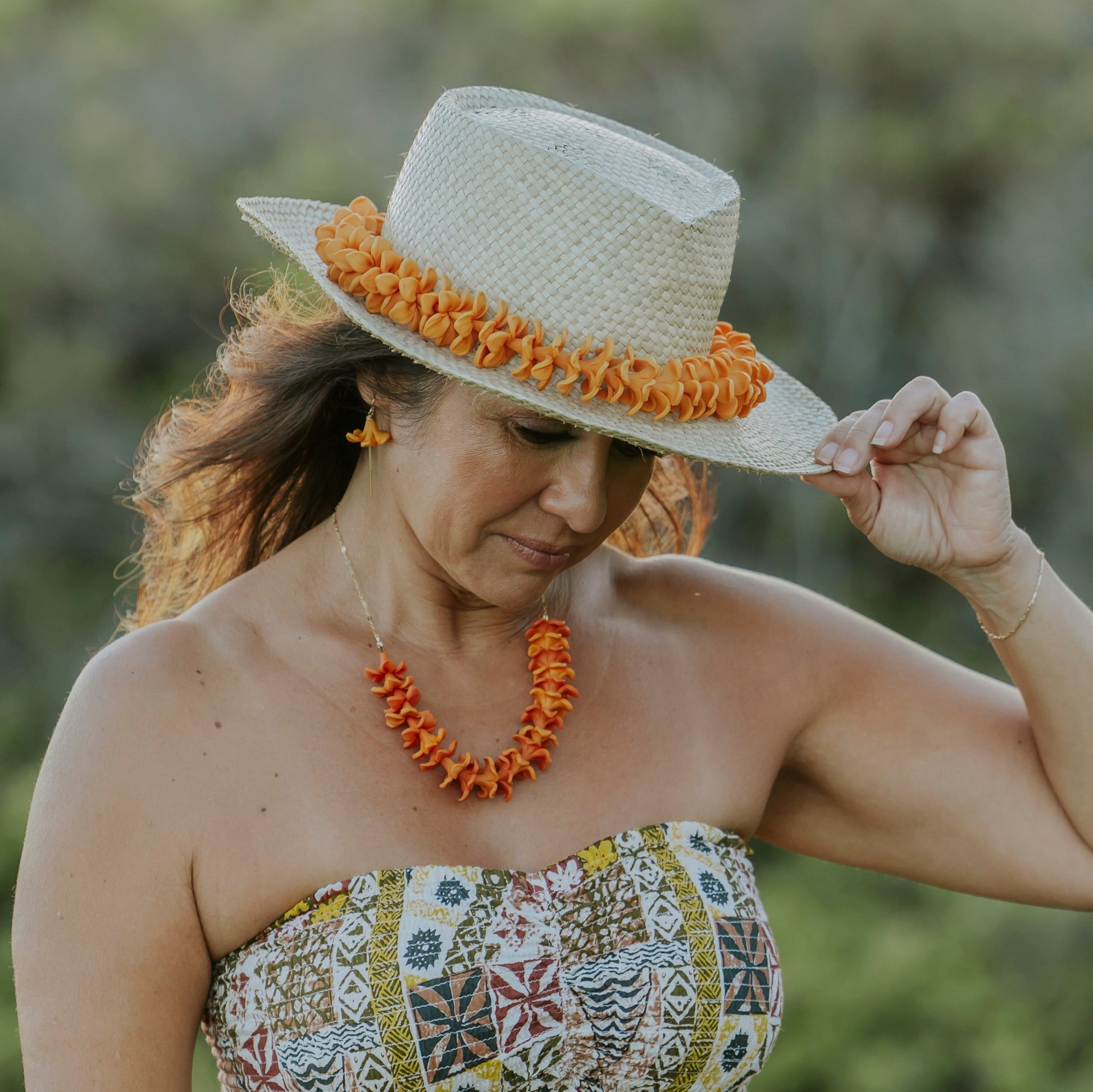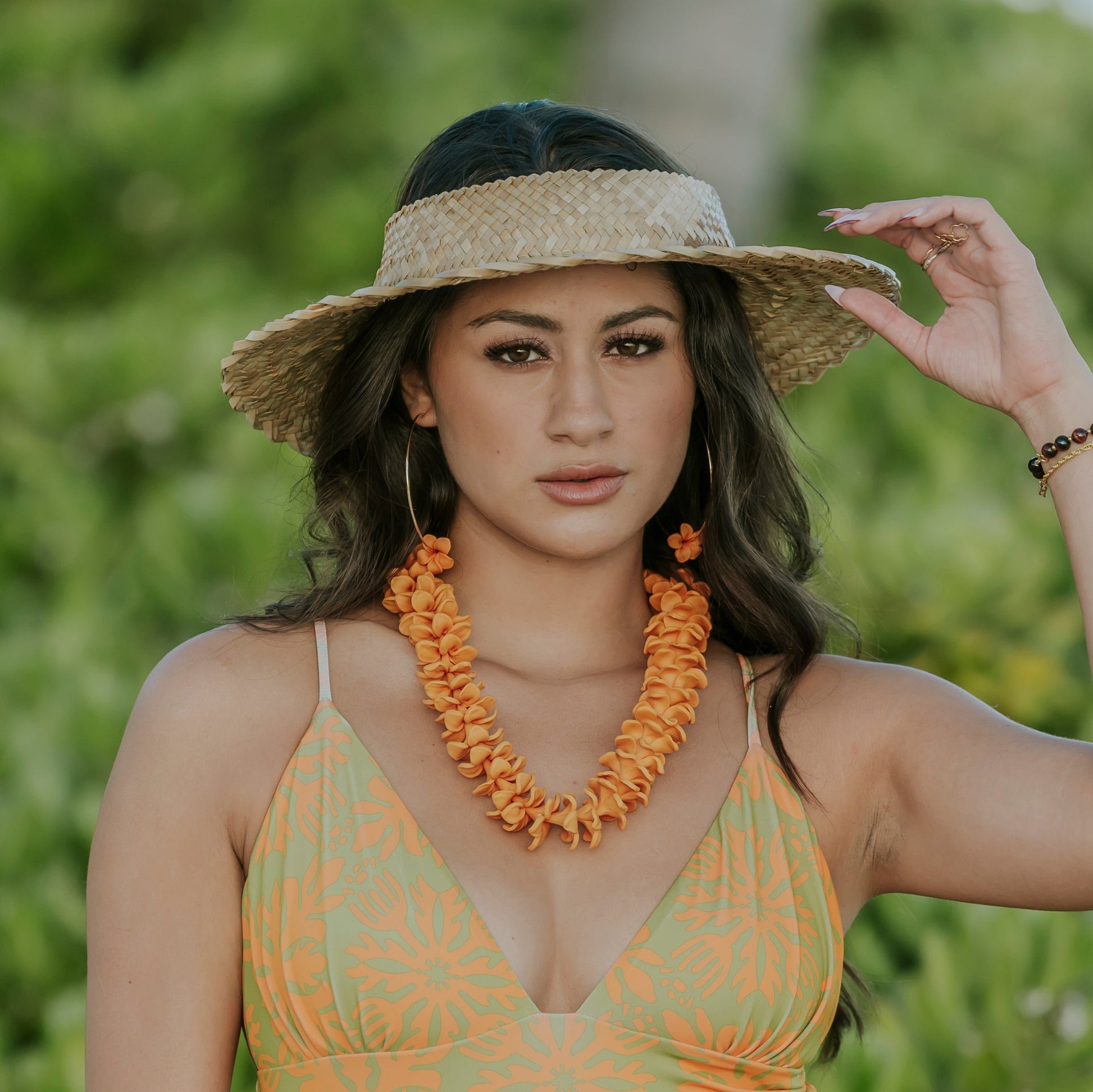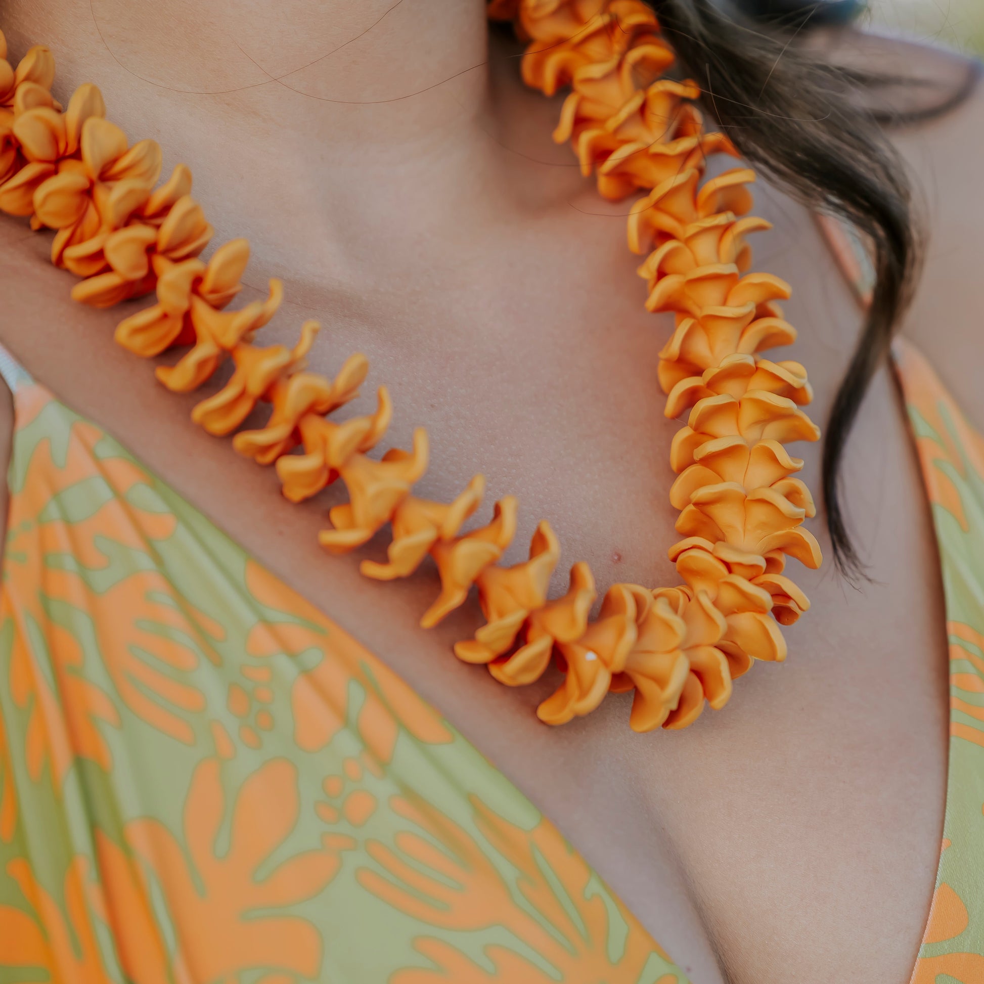 Adorn your favorite papale with a forever flower lei. Each lei is 20" made to fit most papale brims. This versatile piece can also be worn as a lei. 76 flowers, magnet closure. The large puakenikeni are life-sized and include 53 flowers.