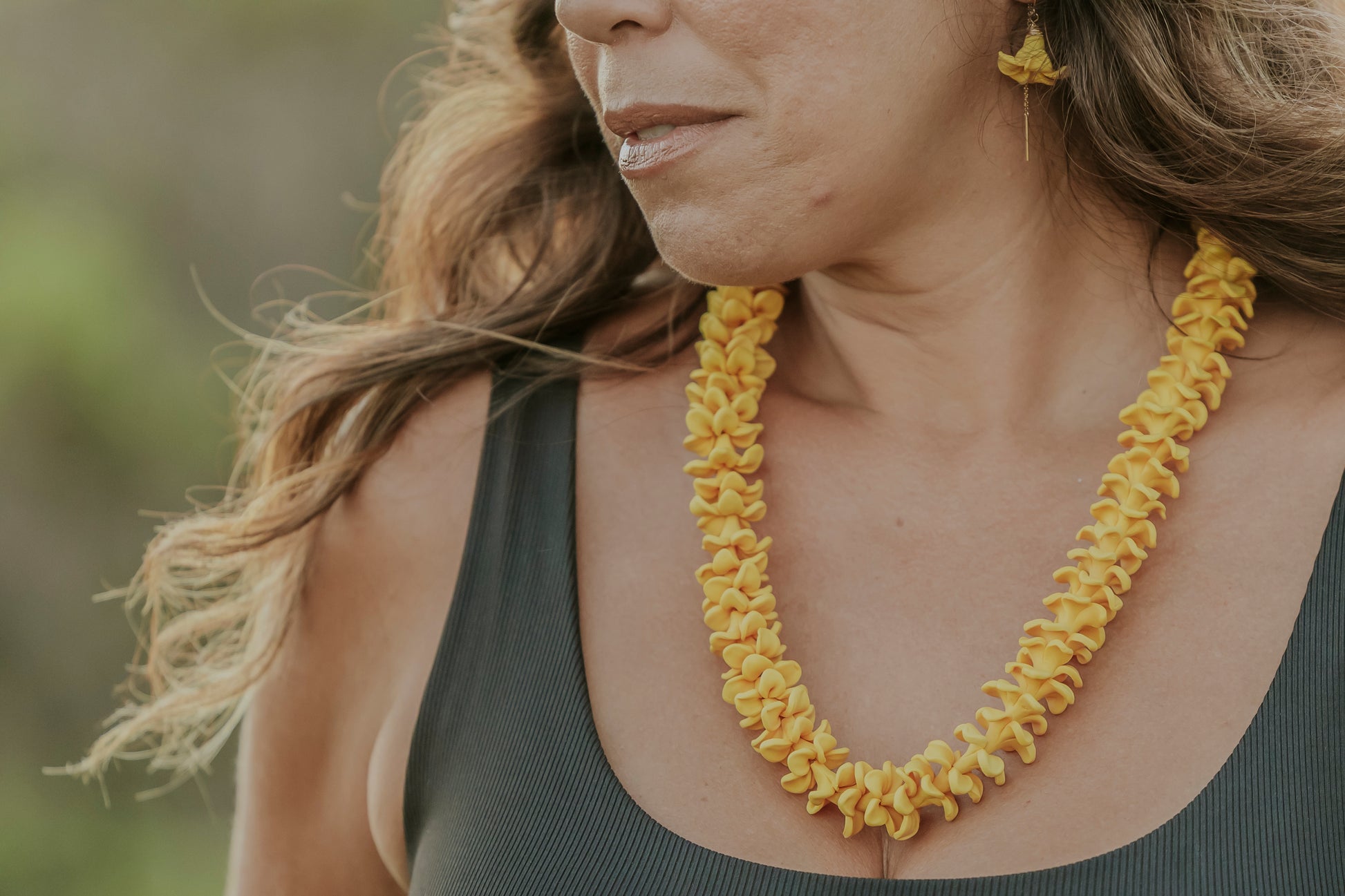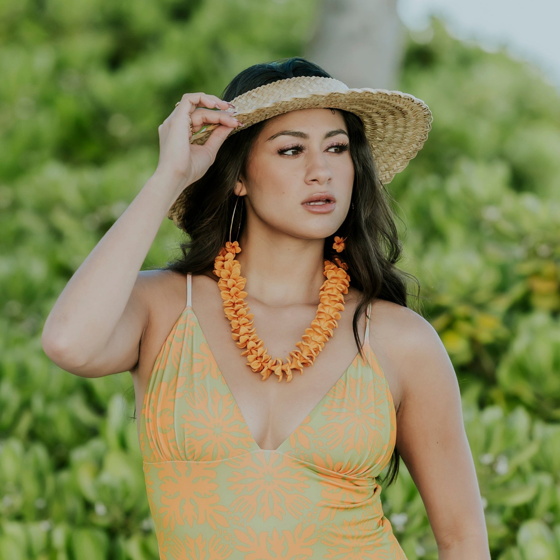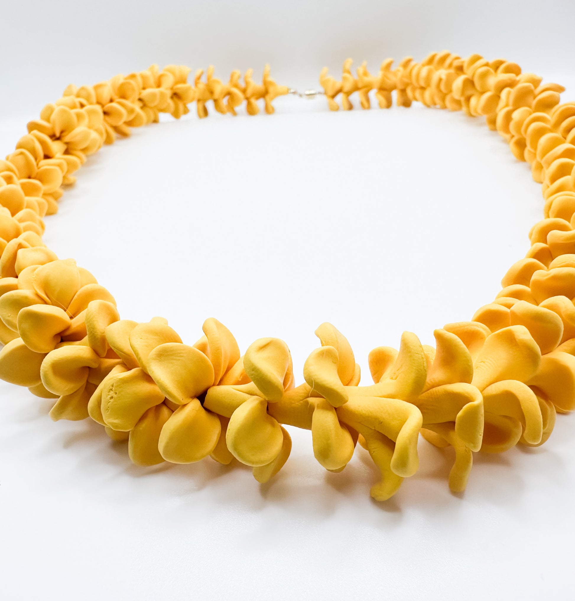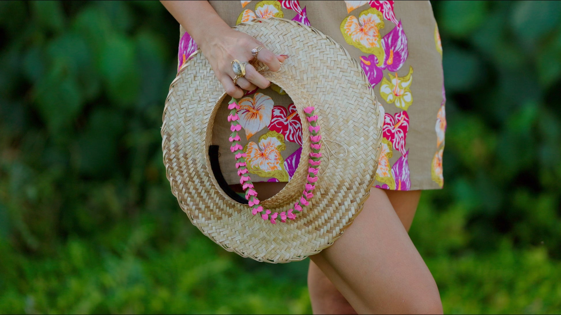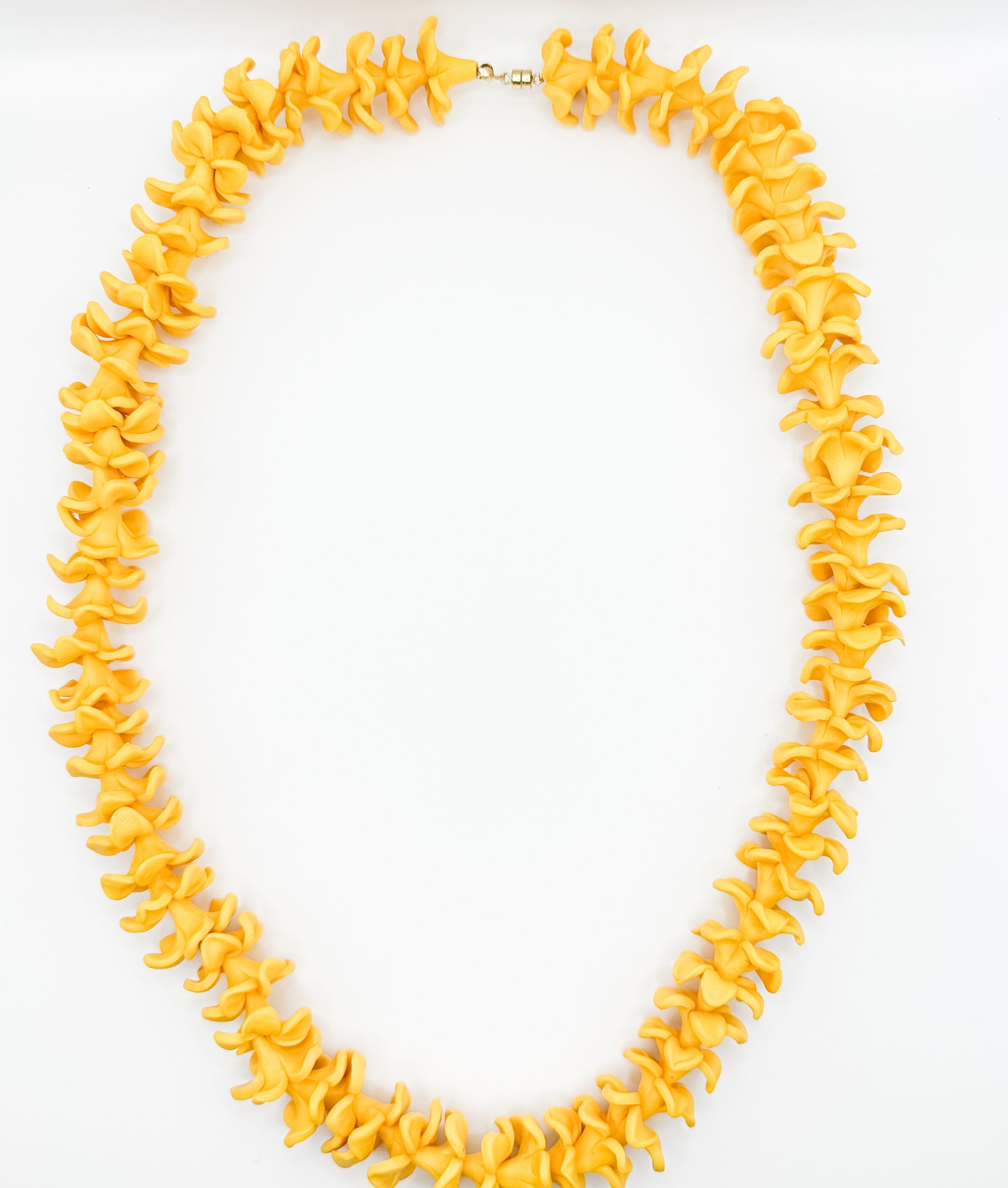 Adorn your favorite papale with a forever flower lei. Each lei is 20" made to fit most papale brims. This versatile piece can also be worn as a lei. 76 flowers, magnet closure. The large puakenikeni are life-sized and include 53 flowers.