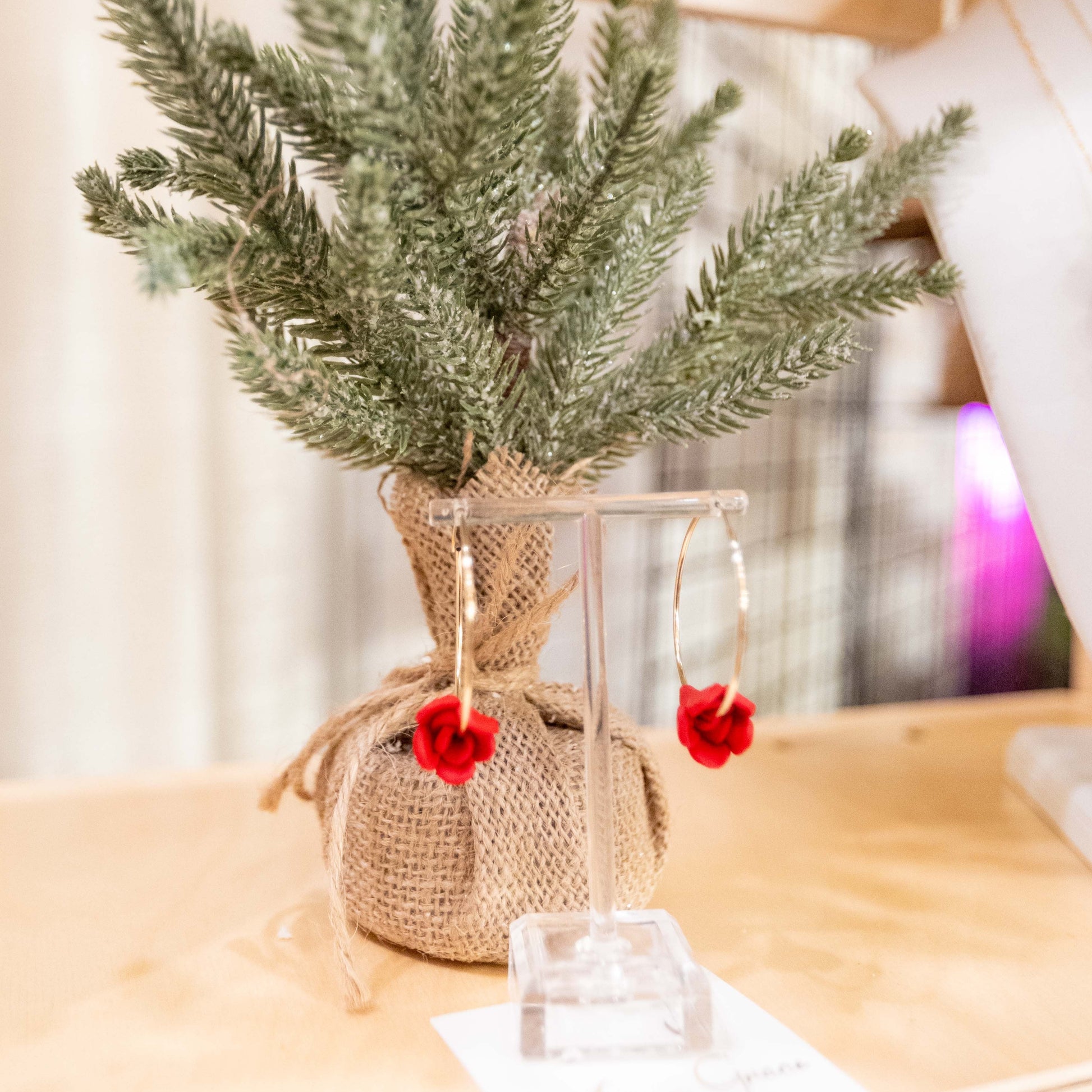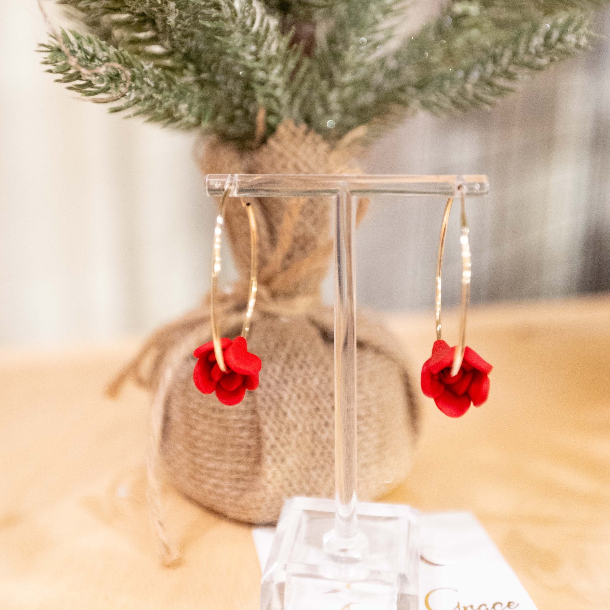 Beautiful red roses perfect for the holiday season, 1 pair of flowers only. For additional pairs of flowers please increase the quantity. Does not include hoops. Handmade polymer clay flowers.