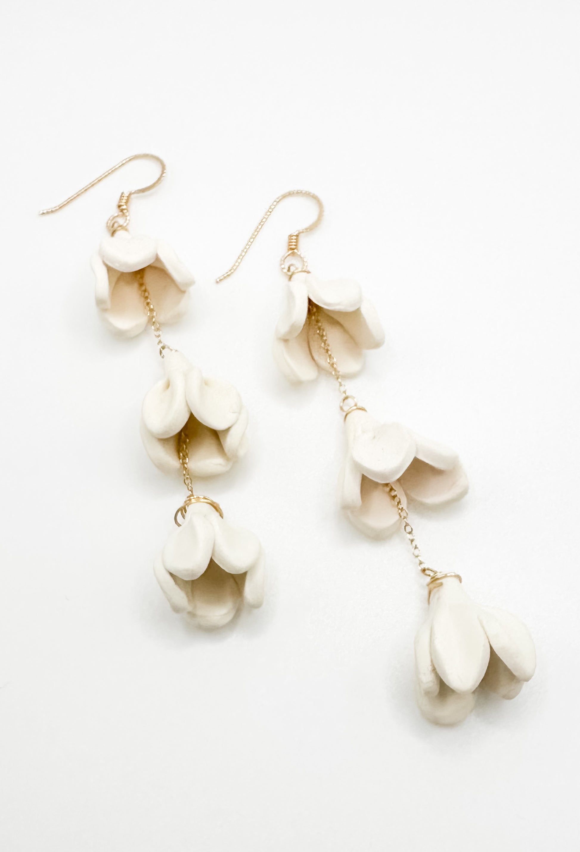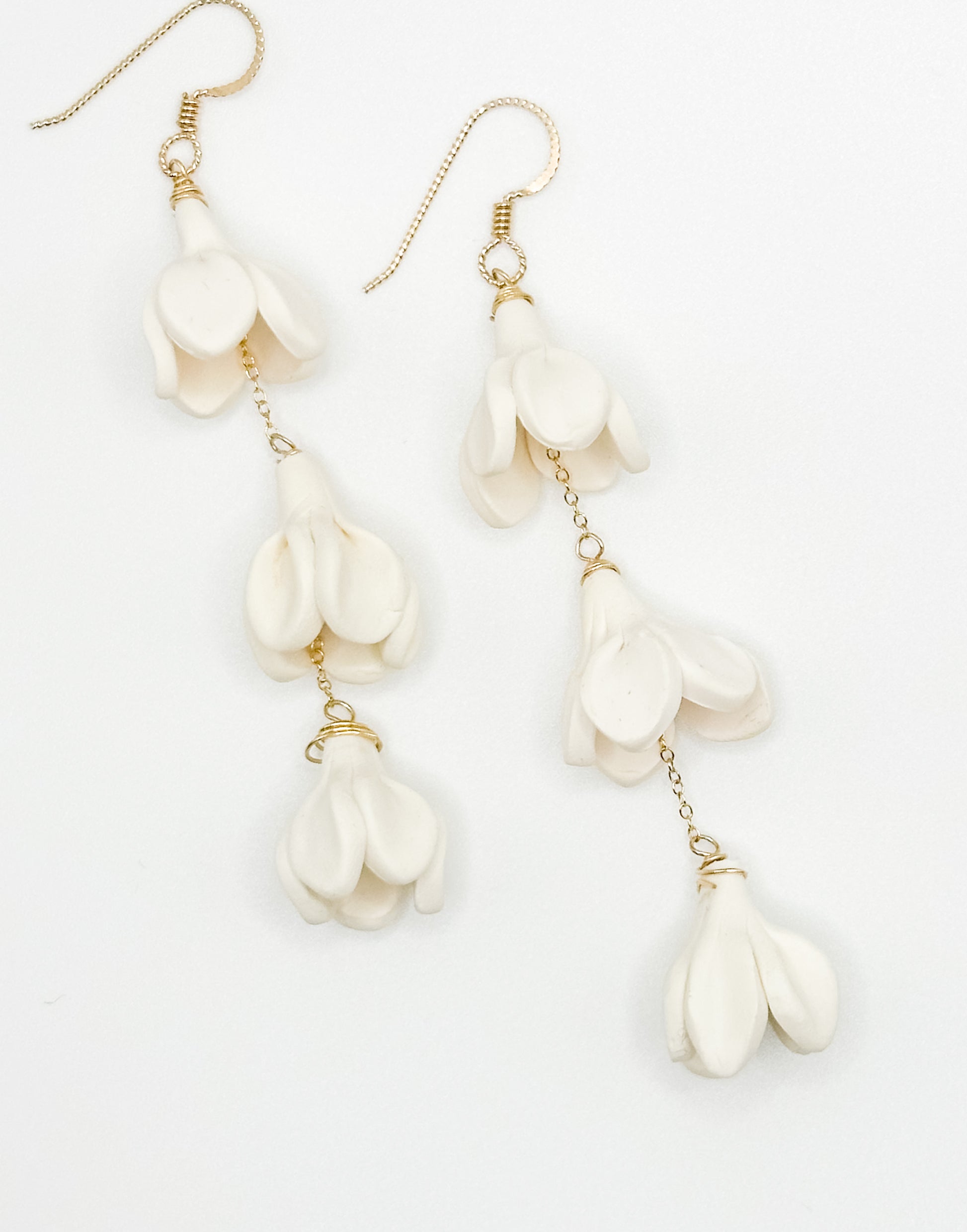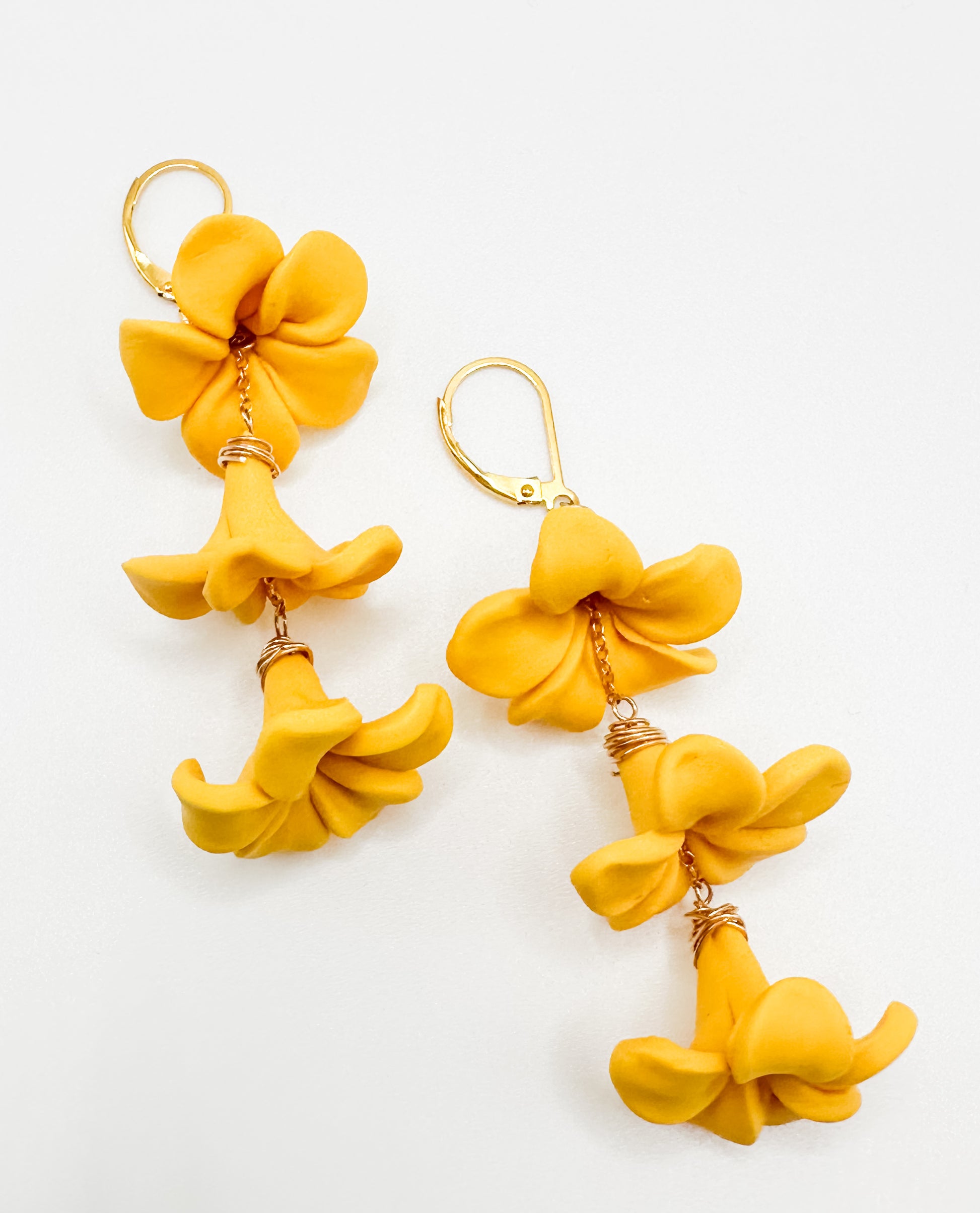 Mini-leis for your ears, these triple drop earrings are light and comfortable to wear all day. 14K gold filled lever-back earring and chain with handmade polymer clay flowers.